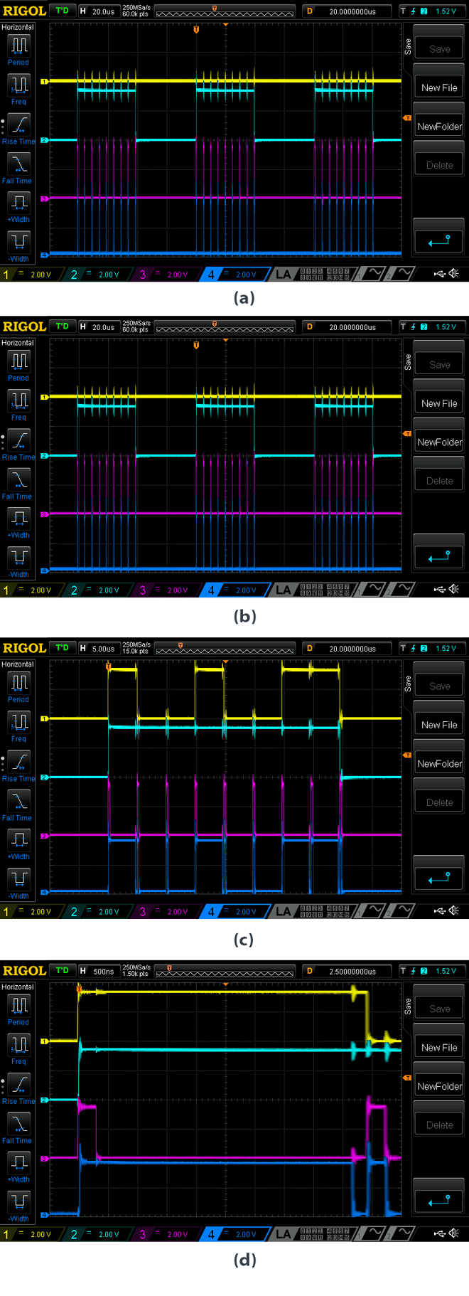 7.這些是“ Transmitter_170”傳輸?shù)氖纠?/span>通道1(黃色)是Serial_OUT,通道2(淺藍(lán)色)是中斷,通道3(品紅色)是時(shí)鐘,通道4(藍(lán)色)是DATA_OUTPUT。這些圖像顯示當(dāng)輸入信號(hào)為00000000(a),輸入信號(hào)為10010011(b),輸入信號(hào)為10010011(c)時(shí)以及信號(hào)值較高的單個(gè)周期的縮放視圖(d)。