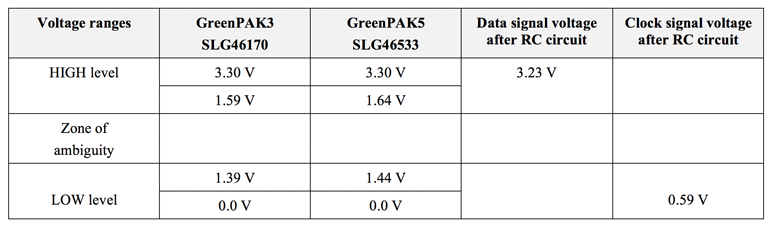 通過RC元件后收到的數(shù)據(jù)信號(hào)電壓必須在邏輯一個(gè)電壓的一定范圍內(nèi)(圖2的綠色區(qū)域)。 時(shí)鐘信號(hào)電壓不應(yīng)通過RC元件,也不應(yīng)超出邏輯零電壓范圍(圖2的紅色區(qū)域)。 它們之間有一個(gè)模糊區(qū)域,完全可能存在錯(cuò)誤狀態(tài)。因此,必須選擇電容器的容量和電阻器的電阻,以使所有“充電/放電”瞬態(tài)電壓值都不會(huì)落入該區(qū)域。這樣做的方法如下: