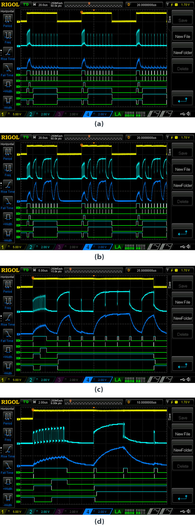 9.這些是“ Receiver_170”接收的示例。通道1(黃色)是CNT2,通道2(淺藍(lán)色)是RC電路之前的外部信號(hào),通道3(品紅色)是RC電路之后的外部信號(hào),通道4(藍(lán)色)是CLK。這些圖像顯示當(dāng)輸入信號(hào)為00000000(a),輸入信號(hào)為10010011(b),輸入信號(hào)為10010011(c)時(shí)以及信號(hào)值較高的單個(gè)周期的縮放視圖(d)。