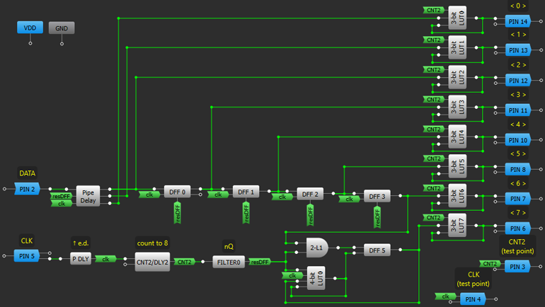 基于3位LUT0÷3位LUT7的八個(gè)鎖存器,用于將并行代碼饋入輸出PIN