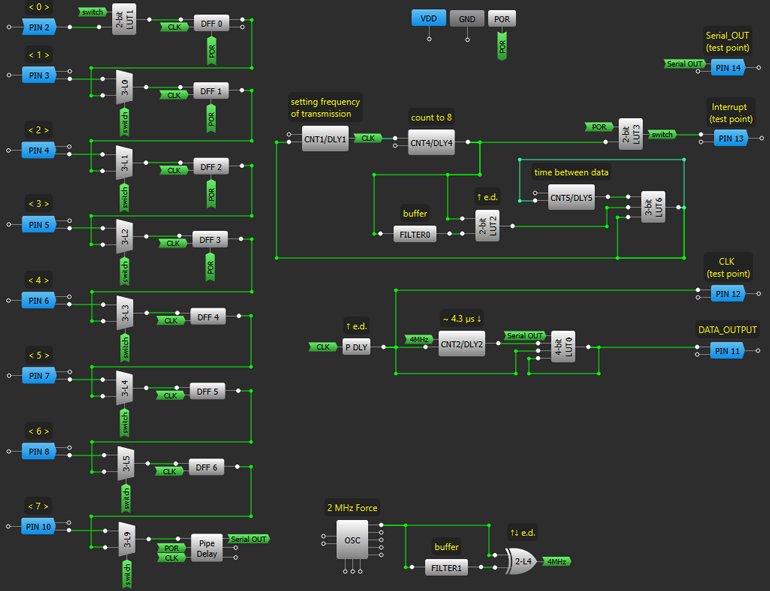 CNT1計(jì)數(shù)器定義了傳輸信號(hào)時(shí)間(如前所述,設(shè)置為?5 μs)。CNT4計(jì)數(shù)器形成八個(gè)這樣的時(shí)間段的數(shù)據(jù)包,并使用2位LUT3反相器控制2位LUT1、3位LUT0÷3位LUT5和3位LUT9多路復(fù)用器。當(dāng)來自2位LUT3反相器輸出的內(nèi)部“開關(guān)”信號(hào)為低電平時(shí)(圖7,“中斷”信號(hào)),則通過多路復(fù)用器記錄來自輸入PIN#2÷#8,#10的信息執(zhí)行相應(yīng)的觸發(fā)器。然后,當(dāng)“ switch”(“中斷”信號(hào))信號(hào)變高時(shí),觸發(fā)器上的數(shù)據(jù)發(fā)生移位,并形成一個(gè)串行代碼(圖7,“ Serial_OUT”信號(hào))。