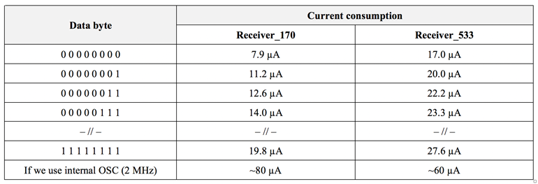 測(cè)得的電流值表明Receiver_533電路芯片消耗的電流略高于Receiver_170電路的電流。這是因?yàn)橛捎谑褂昧烁郊拥妮o助服務(wù)位S1和S0,Receiver_533電路中的傳輸信號(hào)要長(zhǎng)兩位。因此,可以總結(jié)出,帶有RC元件的芯片所消耗的電流遠(yuǎn)小于帶有OSC 2 MHz振蕩器的芯片所消耗的電流。