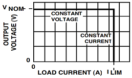 一旦電力系統中的組件進入飽和狀態(即,一旦負載電阻太低),為了安全起見,系統將需要進入恒定電流模式,并且系統應具有限流輸出。下面顯示了針對這種情況的理想系統負載線。實際負載線在低負載電阻下會有一些下降,并且系統應突然進入電流限制狀態。