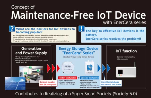 在去年的CES 2019上,NGK Insulators Ltd.(NGK)的硬幣和郵袋類型“ EnerCera”系列榮獲CES創(chuàng)新獎(jiǎng)(在智能能源類別中)。隨著二次電池產(chǎn)品系列的推出,解決物聯(lián)網(wǎng)設(shè)備電池問(wèn)題的期望越來(lái)越大。晶體取向陶瓷板僅由活性材料組成,在小而薄的主體內(nèi)實(shí)現(xiàn)了高能量密度和低內(nèi)阻。它還具有高溫安裝的獨(dú)特特性。EnerCera系列可以運(yùn)行需要大電流(例如,幾10 mA至幾100 mA)的IC,傳感器和無(wú)線通信系統(tǒng)。此外,CV(恒定電壓)充電功能消除了使用充電器IC控制充電電流的需要。EnerCera系列的定位是在不久的將來(lái)提供一次電池的替代產(chǎn)品。