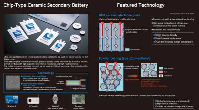 EnerCera有兩種類型:“ EnerCera Coin”,一種厚度為1毫米至2毫米的硬幣型電池,用于安裝在電路板上;“ EnerCera Pouch”,一種超薄且可彎曲的電池,厚度為0.4毫米至0.45毫米,用于嵌入卡。EnerCera硬幣是通過(guò)向其帶有電極和隔板的全陶瓷堆疊式整體中添加少量液體電解質(zhì)制成的。NGK將這些獨(dú)特的電池定義為“半固態(tài)電池”。他們?nèi)〉昧耸澜缟系谝粋€(gè)工作溫度為85°C的鋰離子二次電池,使用壽命長(zhǎng)達(dá)10年,這是對(duì)物聯(lián)網(wǎng)設(shè)備的兩個(gè)很大要求。