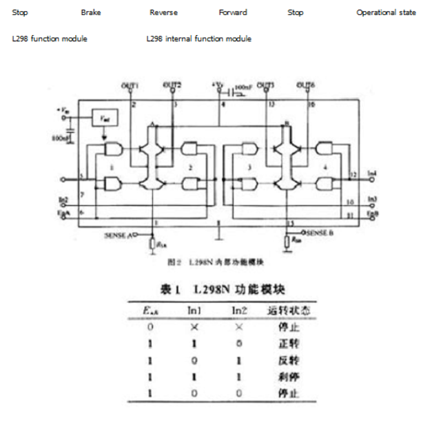 In3,In4的邏輯圖與表1相同。從表1可以看出,當EnA 為低電平時,輸入電平作用于電動機控制。當EnA 為高電平時,輸入電平為高電平和低電平,并且電動機為正或負。相同的低級電動機停止,相同的電動機制動。L298?控制器的原理如下?: