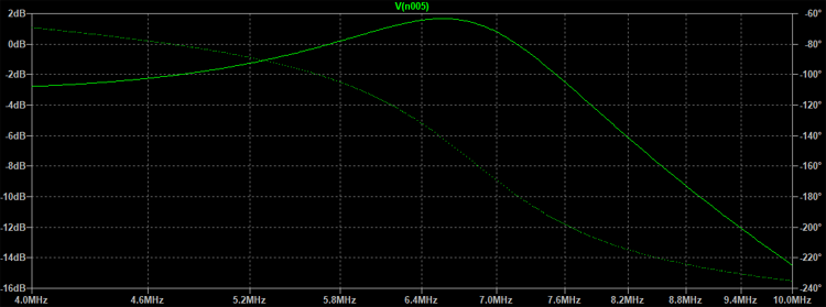 如您所見,濾波器的頻率響應(yīng)是一個(gè)低通,具有一個(gè)在14MHz的諧振峰,如果Q較低,則諧振峰是由濾波器具有較高的Q引起的,該濾波器將是沒有峰的低通。如果我們想要一個(gè)不同的Q,那么該濾波器將具有更高的帶寬,我們將需要使用PI濾波器,因?yàn)?/span>L濾波器的Q取決于源電阻和負(fù)載電阻。如果使用此電路來匹配電子管或晶體管的輸出阻抗,則需要從濾波器的電容器中減去輸出至地的電容,因?yàn)樗鼈兪遣⒙?lián)的。如果我們使用集電極-發(fā)射極電容(即輸出電容)為10pF的晶體管,則C的電容應(yīng)為19.1 pF,而不是29.1 pF。