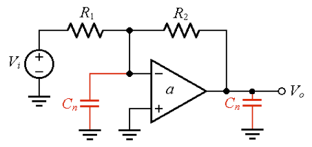 具有放大器寄生電容的電路模型。紅腳顯示的是電流可以作為負反饋傳播回同相輸入的位置