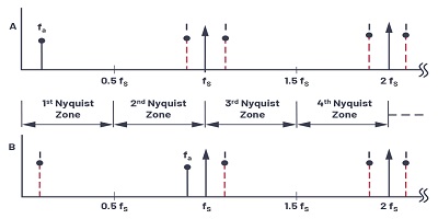 奈奎斯特帶寬定義為從直流到fS / 2的頻譜。頻譜被劃分為無數(shù)個(gè)奈奎斯特區(qū),每個(gè)區(qū)的寬度等于0.5fS。實(shí)際上,理想的采樣器由ADC和FFT處理器代替。FFT處理器僅提供從直流到fS / 2的輸出;也就是說,出現(xiàn)在第一個(gè)奈奎斯特區(qū)域中的信號(hào)或別名。