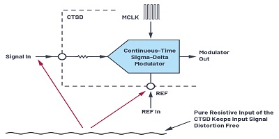 CTSD的兩個(gè)主要優(yōu)點(diǎn)是固有的混疊抑制以及信號(hào)和參考的電阻輸入。