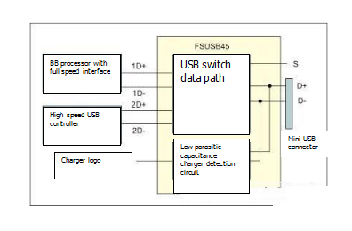 隨著當前市場趨勢轉移到單個USB充電器/數據端口?,特殊應用的USB開關已成為具有充電器檢測功能的手機設計中的常用配置。圖2是此類交換機應用程序的示例。